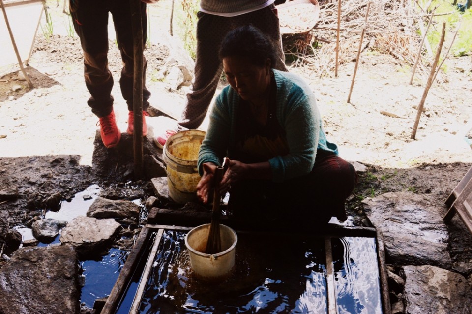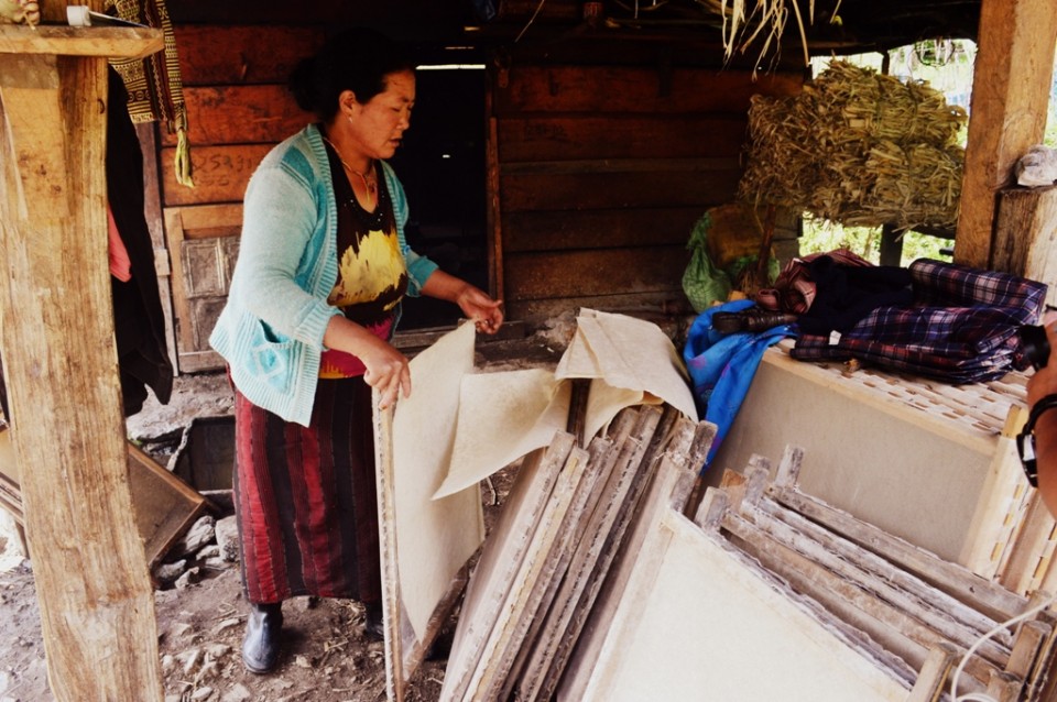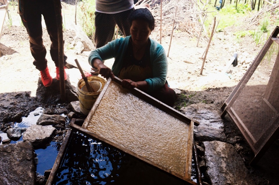 However, we quickly learned that this undertaking faces difficult odds, for as of today as few as 7 or 8 households still practice the art of shuk which means ‘paper’ in the Tawang Monpa language. We went to view the paper making process and watched as an elderly woman showed us the steps.