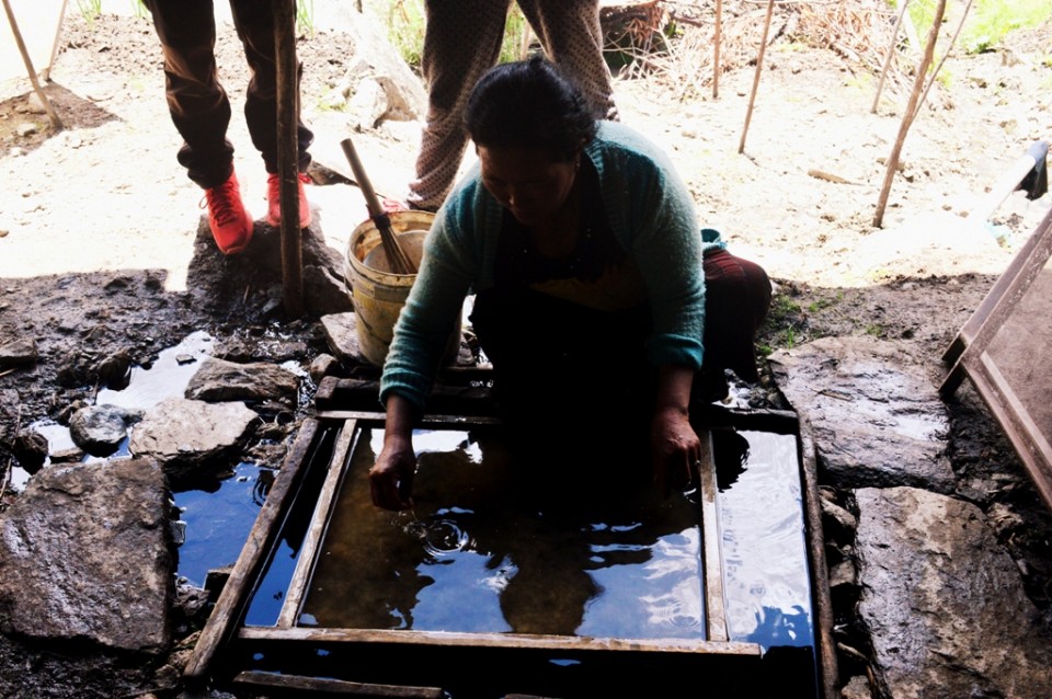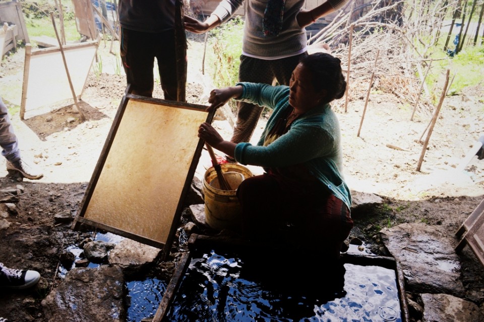 The manual process behind making this paper is very time consuming and cannot be replaced by machinery without sacrificing the unique and beautiful texture of the finished product. The paper is sold to local craft centers and to monasteries. But unlike weavers, for example, whose goods are finding their way into a blossoming market for boutique textiles, the paper makers of Mukto do not enjoy a channel of international demand.